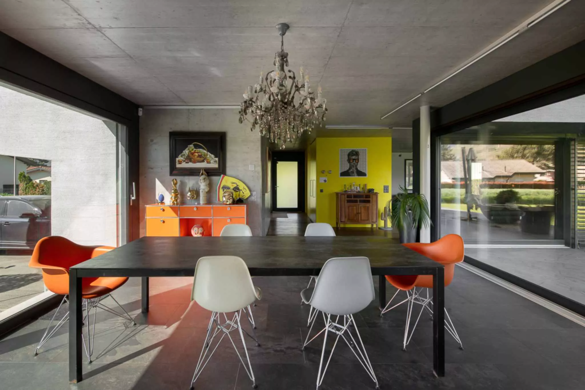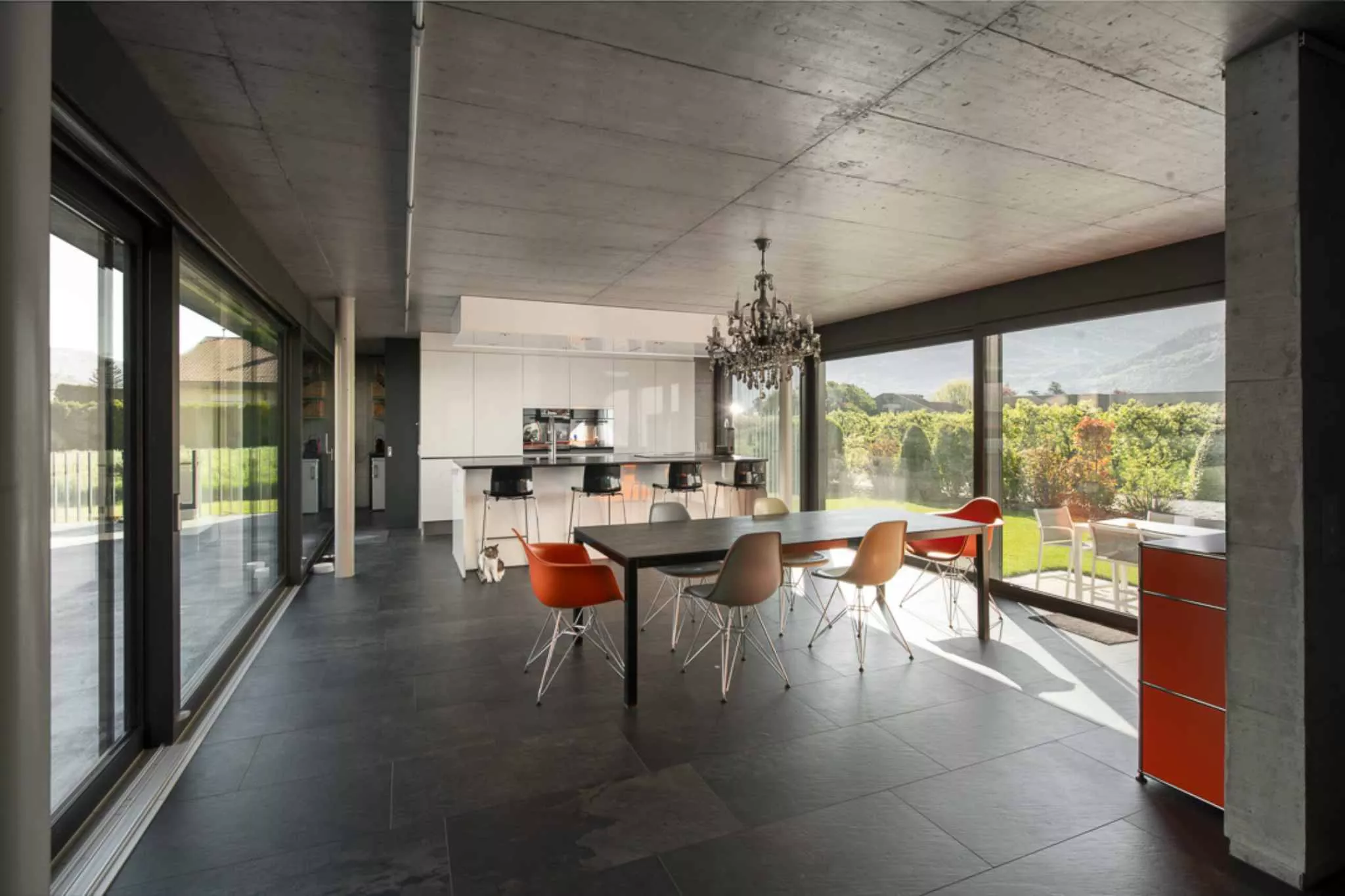 La pièce de vie se prolonge par une grande salle à manger avec cuisine ouverte moderne, offrant un accès direct à une magnifique terrasse d'environ 50 m2, suivie d'un vaste jardin de 1'000 m2 parfaitement entretenu.