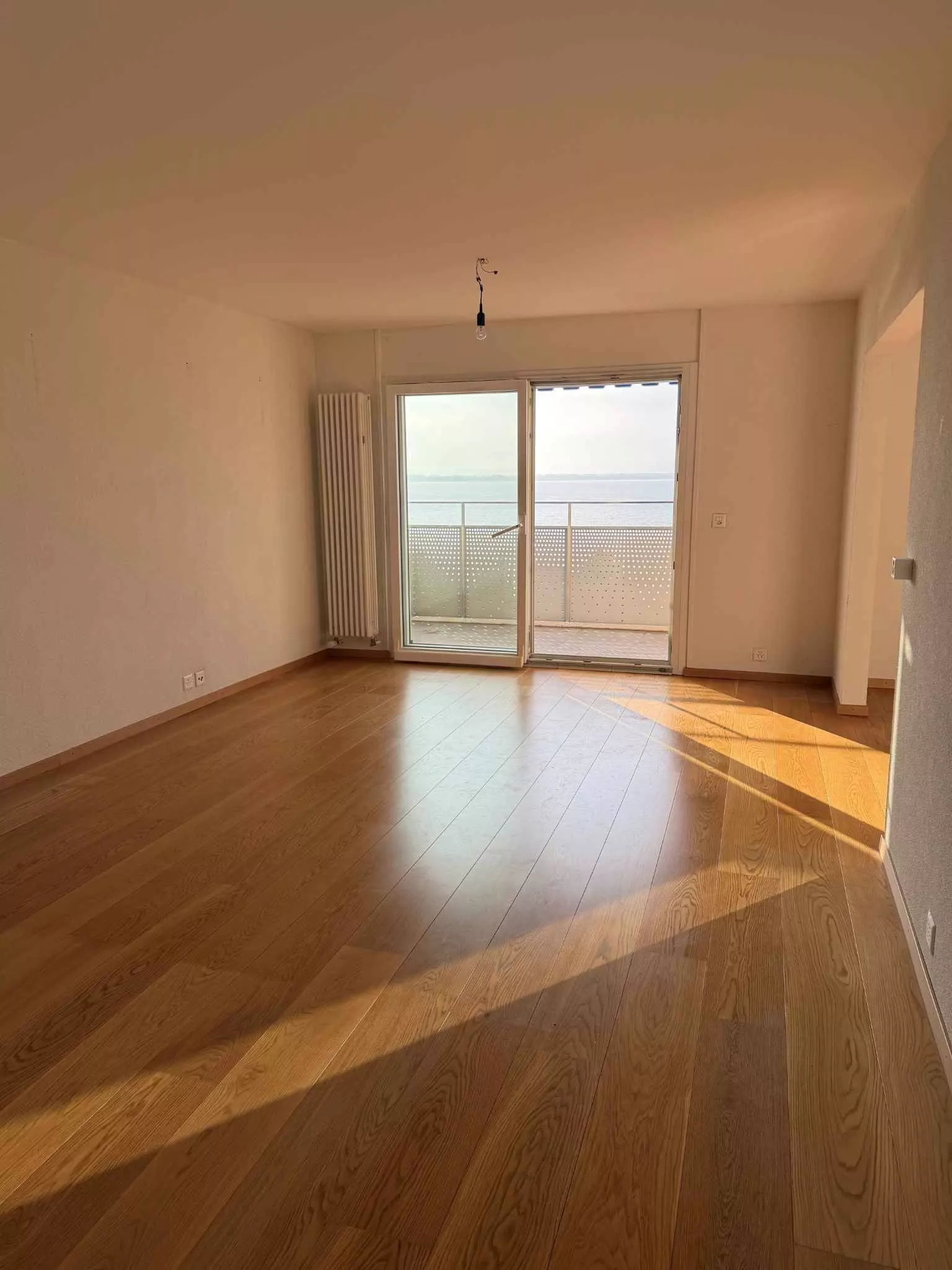 - Salon spacieux : Espace de vie ouvert avec parquet, accès au balcon offrant une vue spectaculaire sur le lac,
