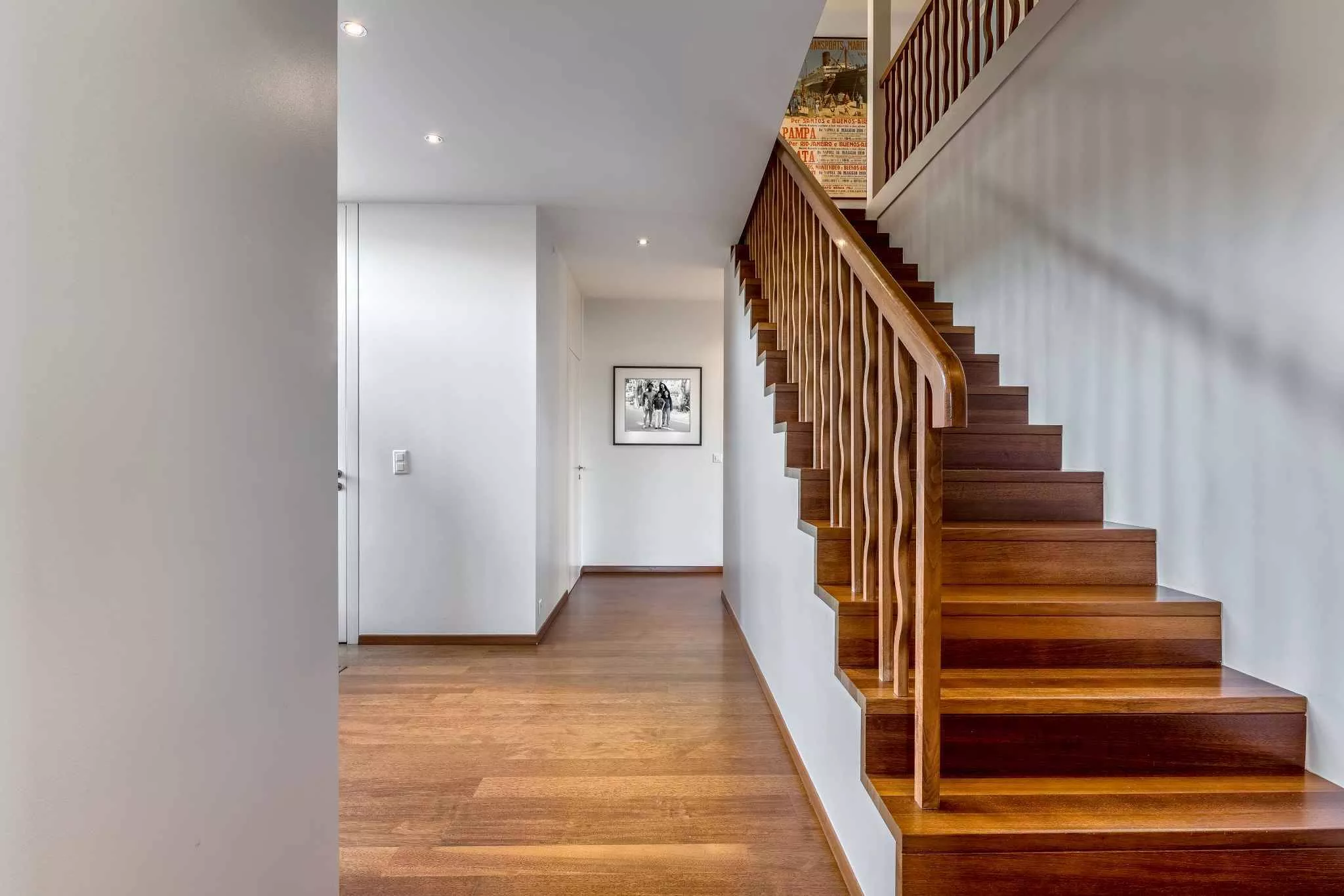 La villa se développe sur trois niveaux hors-sols, complétés par un sous-sol. Au rez-de-chaussée, les pièces de vie spacieuses et lumineuses s'ouvrent sur le jardin et les terrasses. Le premier étage accueille cinq chambres à coucher, dont une belle suite parentale avec salle de douche attenante. Les combles ont été aménagées en une grande salle polyvalente, parfaite comme salle de jeux, bureau ou espace de loisirs.